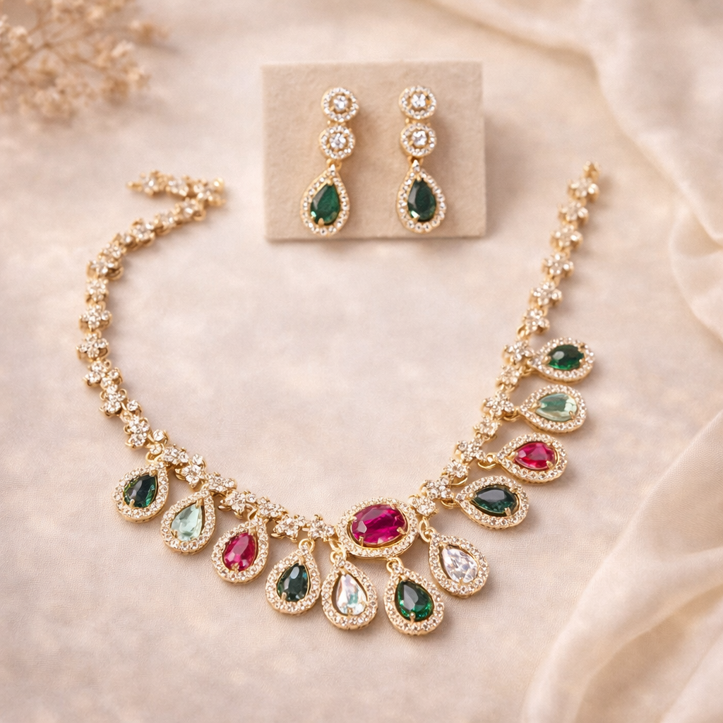 Emerald Bloom Designer Bridal Necklace Set – Green Gemstone Statement Jewelry for Wedding & Festive Wear