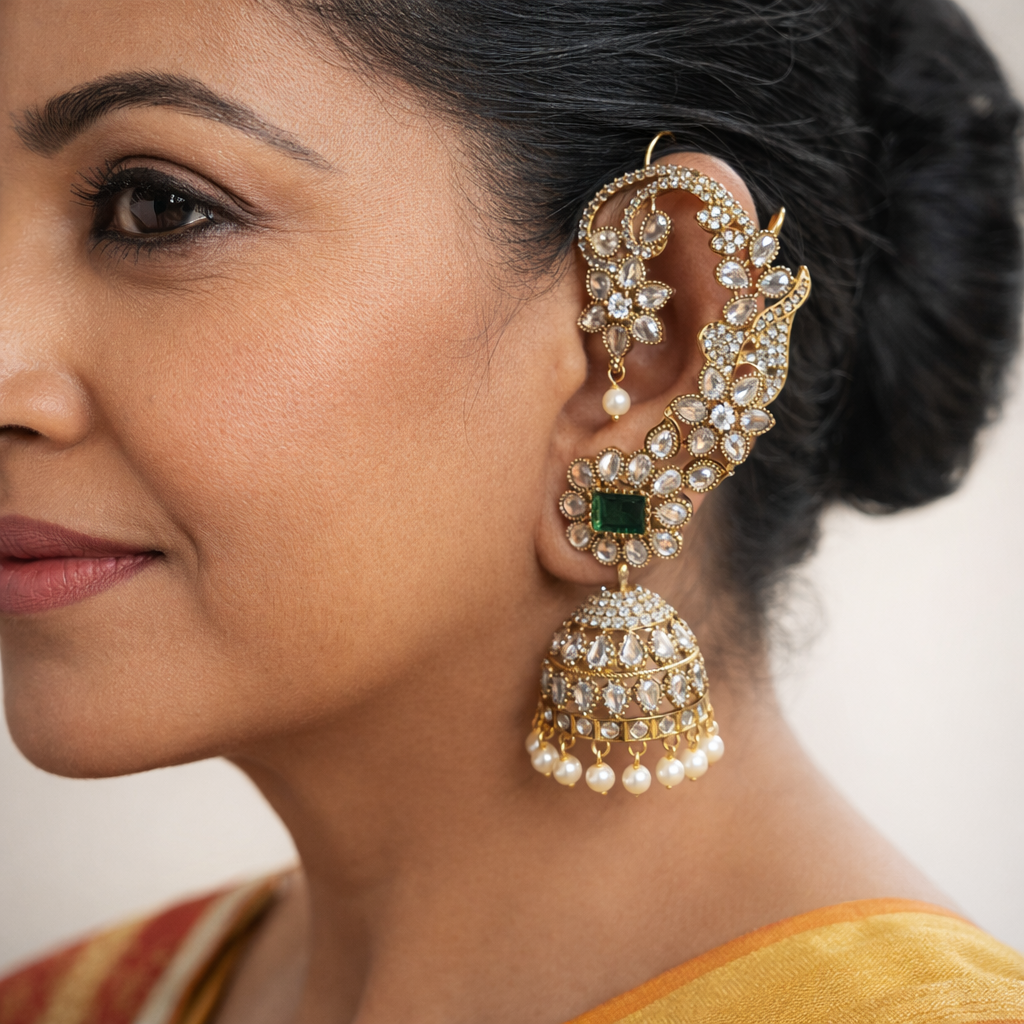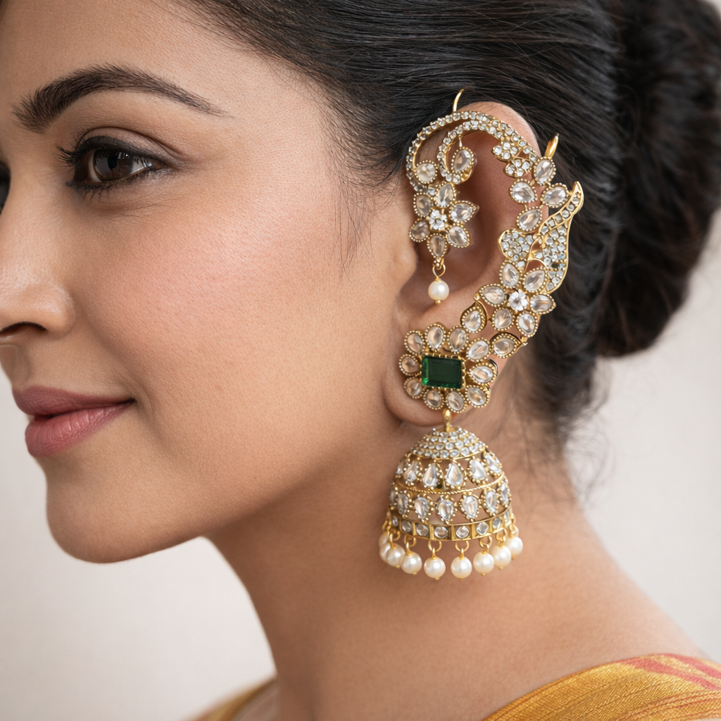 Inspired by classic Indian heritage design, these designer earrings combine the grandeur of traditional jewelry with a bold, modern silhouette. The unique ear cuff style curves gracefully along the ear, creating a regal frame of floral and leaf motifs, making it a true statement product for women who love standout ethnic pieces.