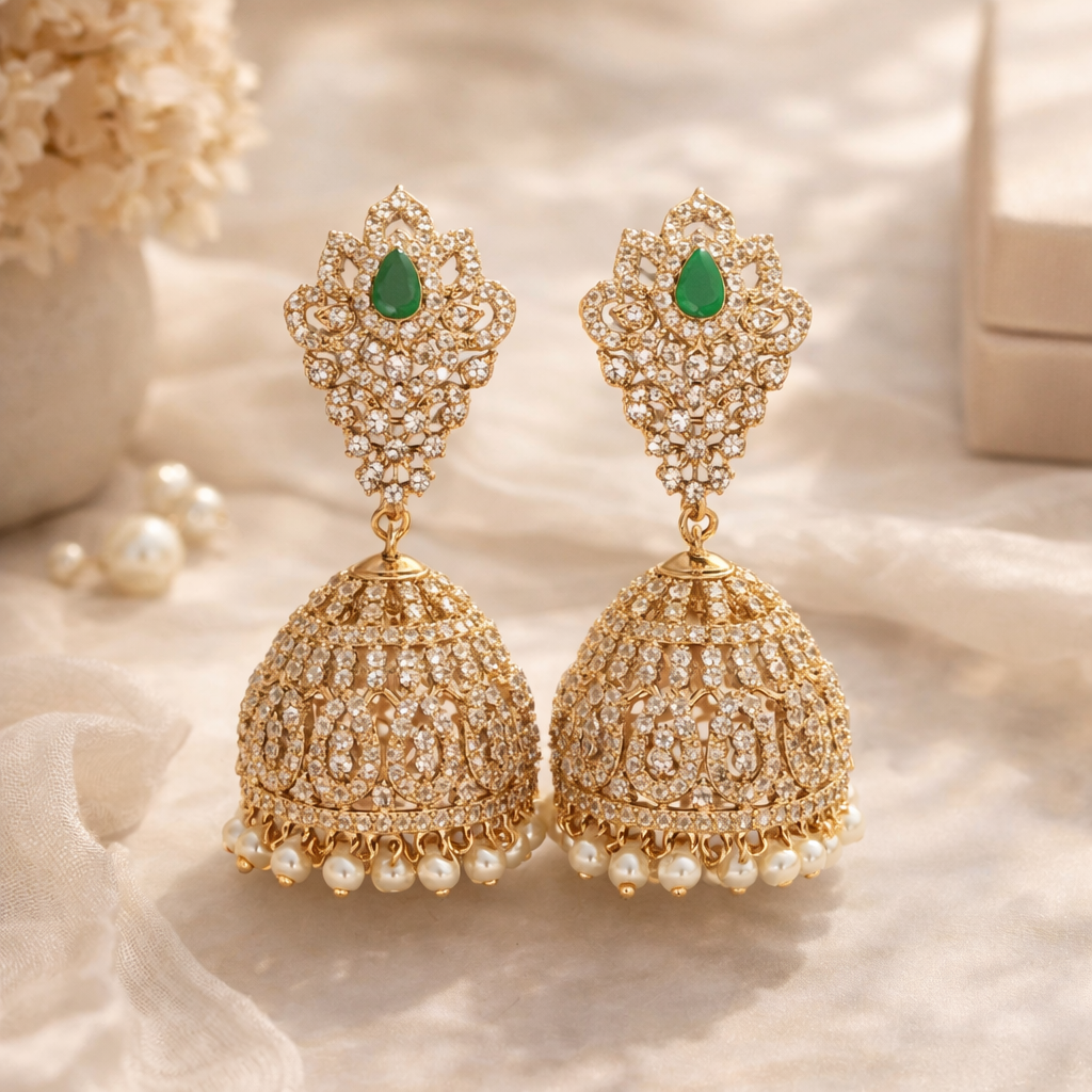 Style with a sleek bun or braided hairstyle to highlight the earrings. Pair with a matching green stone necklace or keep the neckline minimal to let the jhumkas stand out. Opt for bold eye makeup and a classic lip shade for a complete traditional look.