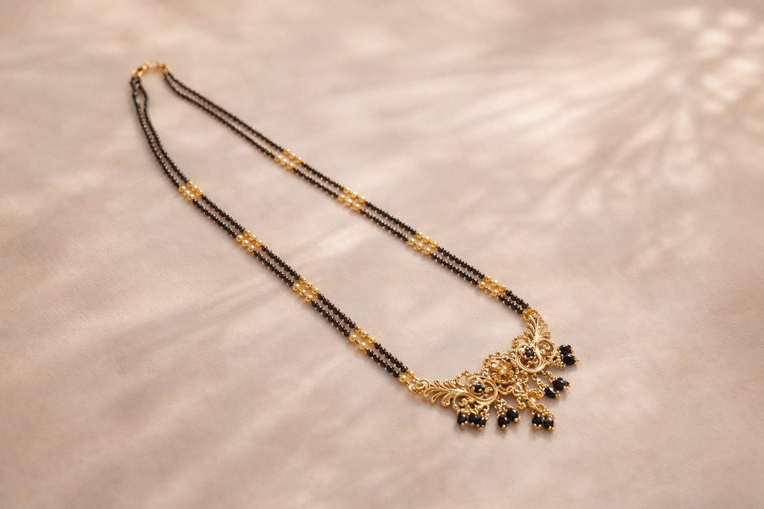 An elegant antique gold mangalsutra featuring delicate floral filigree and dual black bead chains. Designed as a timeless traditional jewelry piece, perfect for bridal wear and festive occasions.