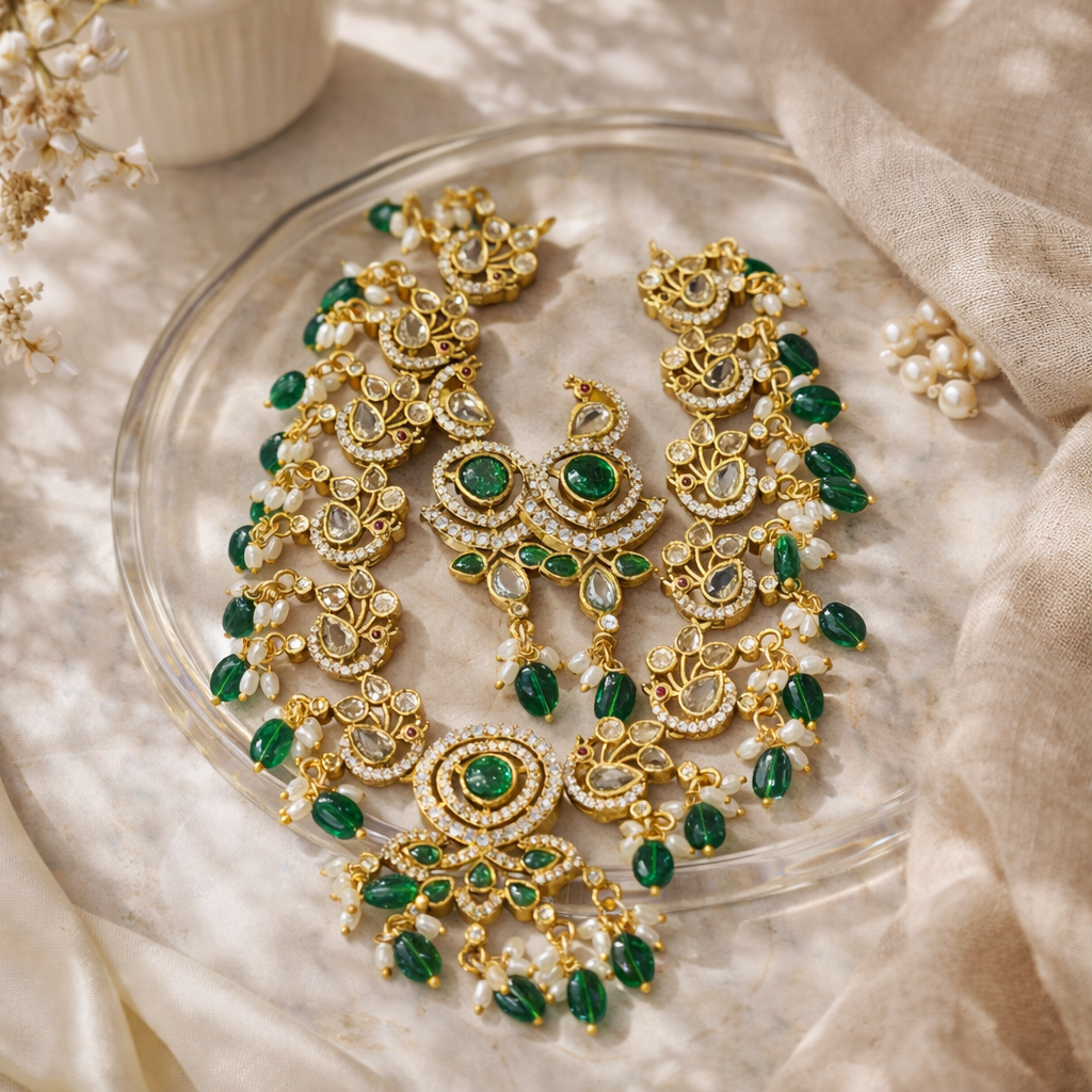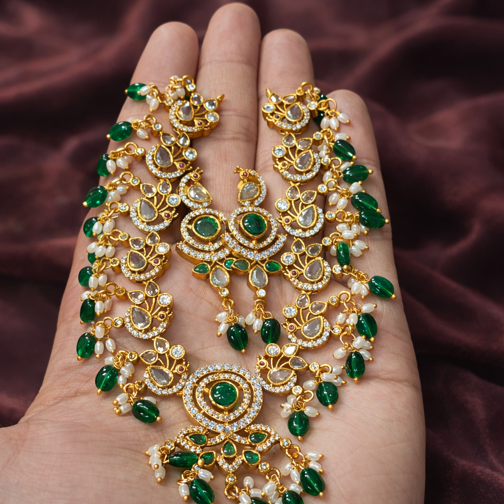 The necklace features rich emerald green cabochon-style stones set within detailed gold-tone frames, surrounded by shimmering white stones that add brilliance and contrast. Teardrop-shaped accents and delicate stone borders enhance its traditional jewelry appeal. The lower edge is adorned with hanging green bead drops and petite pearl clusters, creating graceful movement and a luxurious finish. The bold circular pendant at the center elevates the design, making it a powerful statement product for women who appreciate timeless ethnic aesthetics.