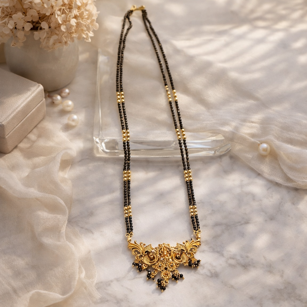 A timeless gold-tone mangalsutra necklace featuring an intricately carved Lakshmi-inspired pendant and dual black bead chains. Designed as a traditional bridal jewelry piece, it blends cultural heritage with elegant everyday grace.