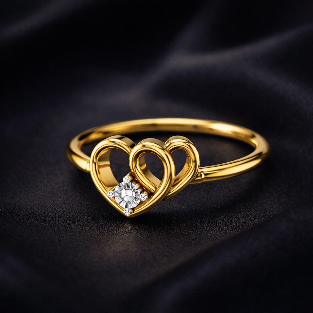 Crafted in a polished yellow gold finish, the band is sleek and refined, offering a smooth, comfortable fit. One of the hearts features a delicate diamond accent at its base, adding a gentle sparkle without overpowering the design. The open-heart structure keeps the look airy and contemporary, making it ideal for women who love modern jewelry with emotional depth. The diamond detail enhances its appeal as a thoughtful gifting option while maintaining a lightweight, wearable feel.